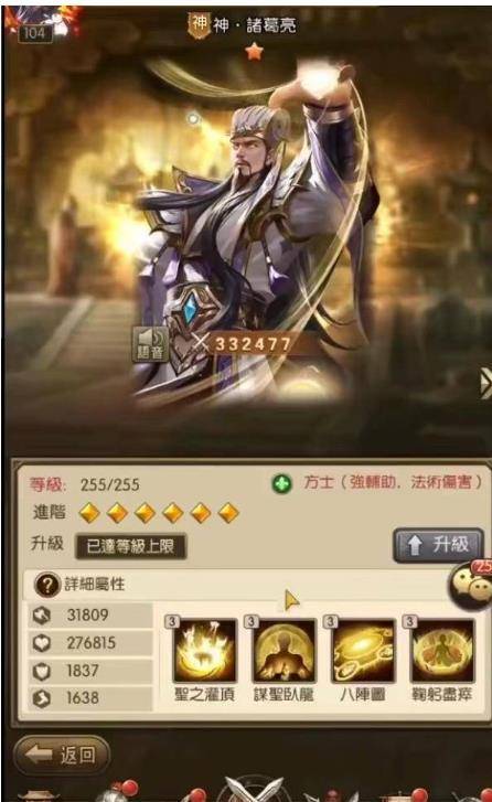 1、 三个有培养价值的武将,第一个就是神诸葛。他是所有阵容都能带上的一个武将,非常强的单体输出类武将,并且各种技能都有加成,比如减伤、回血、解负面状态等等都有可以换成正向的状态等等都是有的,所以是最方便使用的武将以及前期资源不多的时候最好的选择。